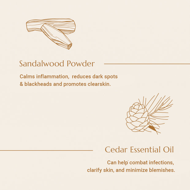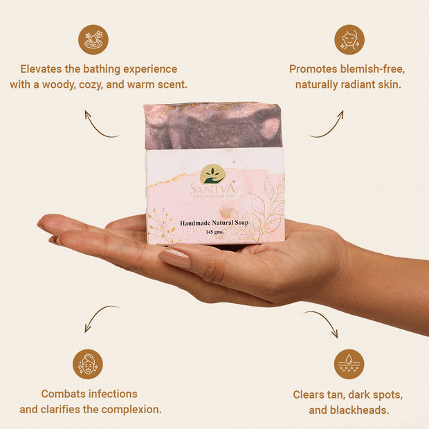 Crafted thoughtfully with Sandalwood Powder and Cedar Essential Oil, this soap brings you nature's secret for flawless skin. Sandalwood helps gently remove tan, dark spots, and acne, leaving you with a brighter complexion. Cedarwood's natural antiseptic properties combat microbial infections, while blemishes fade away. Elevate your senses with the warm-woody scent of Santva’s Sandalwood Soap and embrace the confidence of naturally beautiful skin.